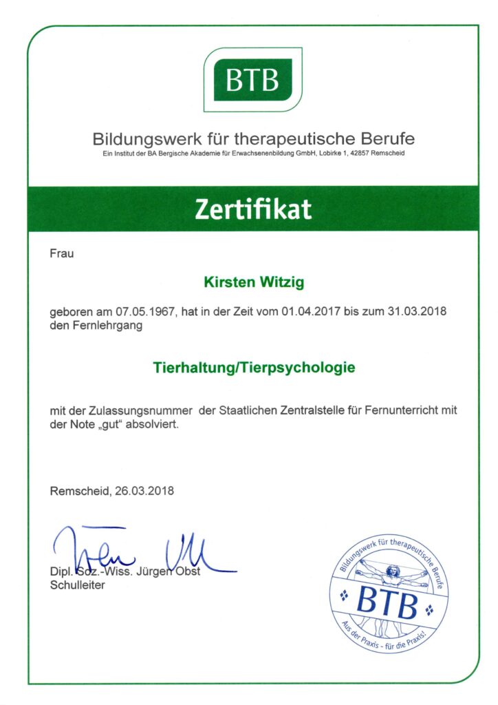 Ausbildung in Evolutionsbiologie, artgerechter Haltung und verhaltensbiologischen Grundlagen zahlreicher Heim-, Nutz- und Begleittiere.